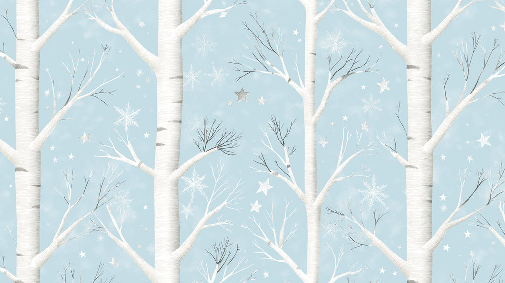 Il Murale della Foresta di Betulle Capricciosa presenta una scena magica di una foresta di betulle in un capriccioso paesaggio invernale. I tronchi bianchi delle betulle si stagliano contro uno sfondo leggero e azzurro chiaro con fiocchi di neve cadenti e stelle bianche sparse. Lo stile dipinto a mano e i dettagli delicati creano un'atmosfera affascinante e incantata, perfetta per uno spazio tranquillo e immaginativo.