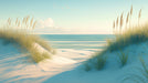Questo sfondo mostra una scena serena di spiaggia con un cielo azzurro chiaro, nuvole bianche e soffici e l'oceano che si estende fino all'orizzonte. Nel primo piano si vedono alcune dune di sabbia color crema con erbe alte. L'effetto complessivo è calmante e rinfrescante, rendendo il soggiorno simile a un rifugio costiero. Può portare un senso di tranquillità e apertura allo spazio.