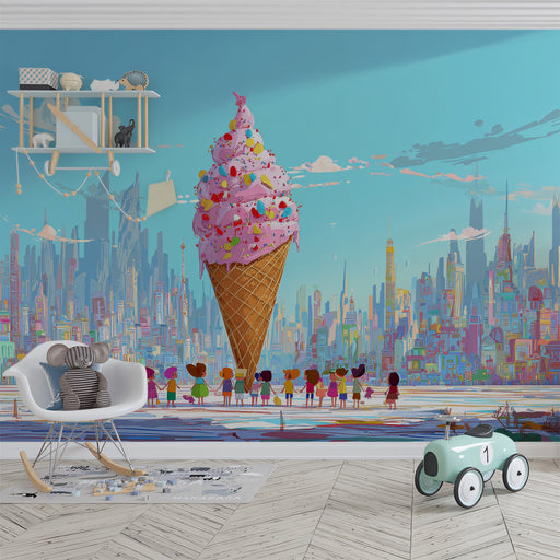 Murale di Carta da Parati con Cono Gelato Gigante Città | Arte Pop Urbana Fantasiosa