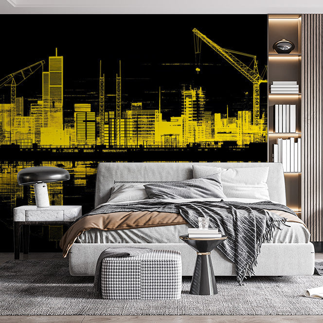 Muro murale per camera da letto con tema cantiere giallo e nero | Costruzione gialla e nera in città