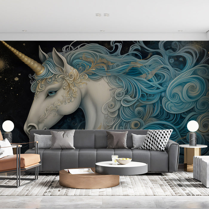 Questo sfondo mostra un maestoso unicorno con una lunga criniera fluente nei toni del biondo e del blu. L'unicorno ha un corno dorato adornato con gioielli dall'aspetto prezioso e una corona di complessi motivi dorati e blu. I suoi grandi occhi blu sono pieni di una luce mistica. Lo sfondo è un blu scuro, simile a un cielo notturno pieno di stelle, con motivi cosmici vorticosi e tocchi dorati. L'effetto complessivo è quello di un puro incantesimo, come se l'unicorno fosse emerso da un regno magico. Può trasformare una camera da letto in uno spazio da favola.