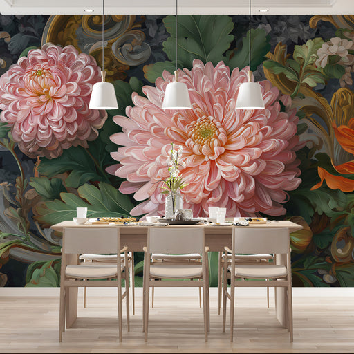 Carta da parati murale con fiori rococò crisantemo | Arte classica con volute dorate