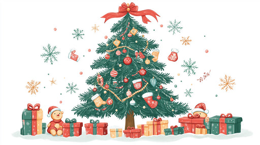 VIVAWALLSQuesto sfondo cattura lo spirito semplice e gioioso del Natale con un'illustrazione grafica senza tempo. Aalbero di Natale verde classico, decorato...
