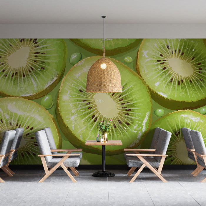Questo sfondo mostra un pattern di frutti di kiwi tagliati su uno sfondo prevalentemente verde. La polpa verde, i semi neri e le bucce giallo-marroni dei kiwi sono chiaramente visibili, creando un aspetto fresco e tropicale. Il design è ripetitivo, con i kiwi disposti in modo da dare una sensazione di abbondanza. In una sala da pranzo o in una cucina, crea un'atmosfera leggera e rinfrescante, che ricorda un mercato di frutta tropicale. I toni verdi possono portare una sensazione di natura e freschezza nello spazio, mentre il pattern del kiwi aggiunge un elemento visivo unico e interessante.