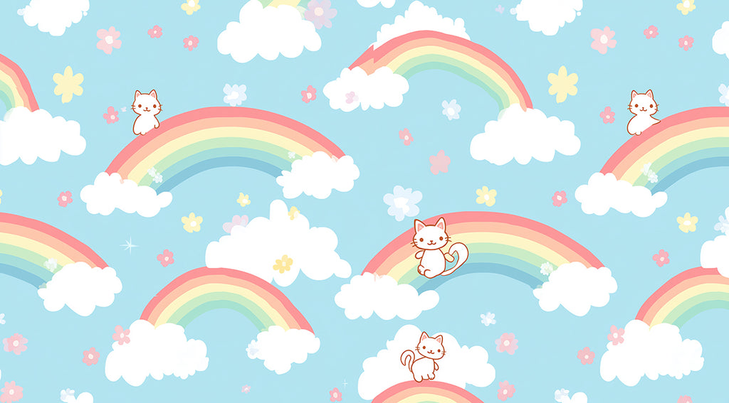 Il motivo arcobaleno nuvola con gattini kawaii è un design allegro e ripetitivo. Presenta diversi arcobaleni colorati che si inarcano sopra nuvole soffici, con giocosi gattini bianchi che si arrampicano o siedono su di essi. Il motivo è impostato su uno sfondo luminoso e chiaro azzurro cielo e cosparso di piccoli fiori pastello. Il motivo denso e ripetitivo crea una scena continua e fantastica. Questo murale è ideale per la stanza di un bambino, una camera da letto o una sala giochi luminosa.