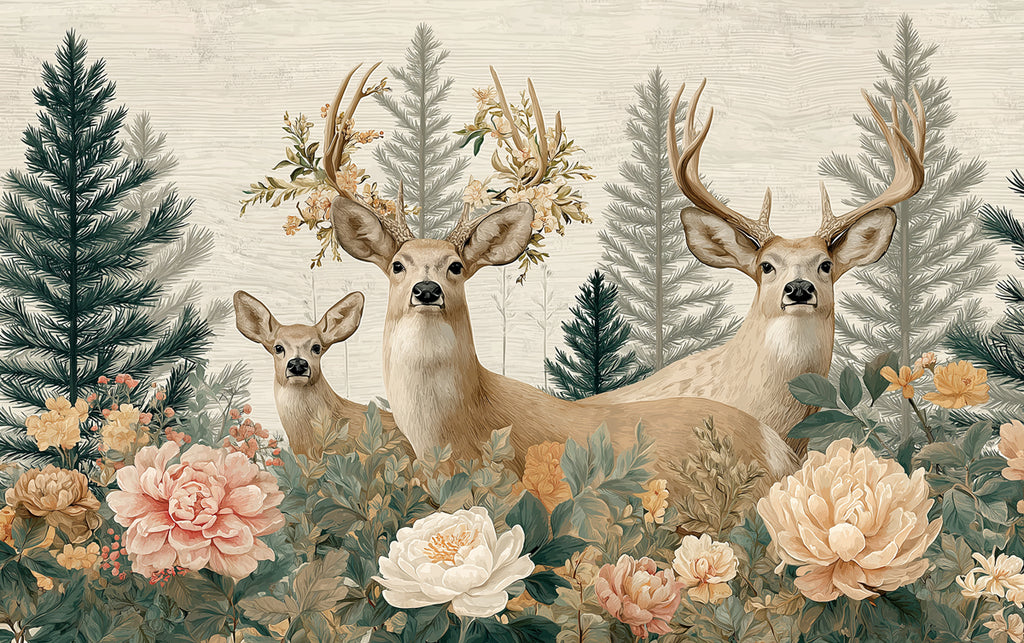 Aggiungi un margine di sicurezza di 6-10 cm. L'area totale è calcolata in metri quadrati e arrotondata al numero intero più vicino.Affresco Murale Rustico di Cervi | Incantevole Bosco con Fiori