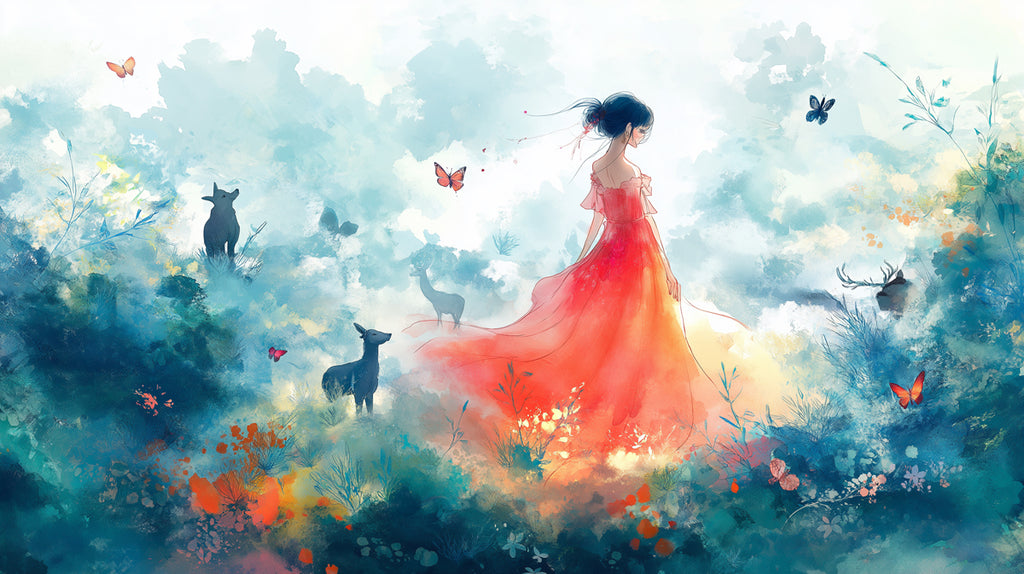 Questo vivace e romantico sfondo raffigura una donna in un magnifico abito rosso fluente, realizzato in uno splendido stile acquerello con influenze anime. Vista di spalle, lei si erge in una magica radura piena di fogliame turbinante nei toni del turchese e del verde, circondata da sagome di cervi e farfalle svolazzanti. La scena è piena di movimento, colore e un'energia sognante e magica.
