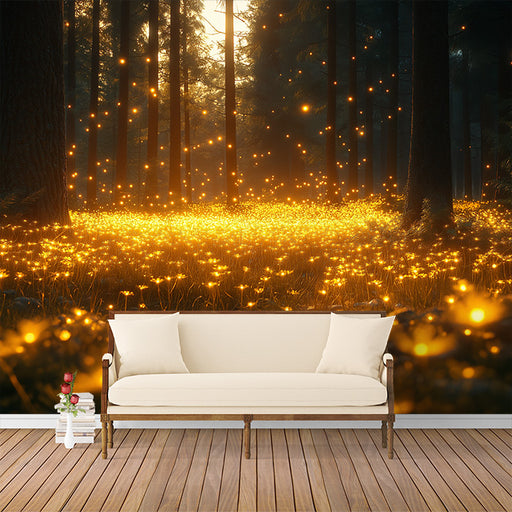 Visualizza tutti i dettagliCarta da parati murale con foresta e lucciole | Lucciole arancioni, gialle e marroni nella foresta