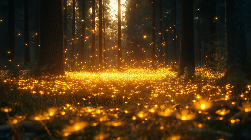 VivawallsQuesto sfondo rappresenta una scena di foresta magica al tramonto, con un tappeto di lucciole dorate che illuminano il terreno. Gli alberi alti sul...