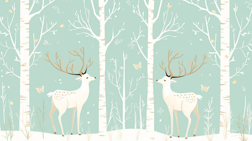 VivawallsQuesto sfondo mostra una scena serena di foresta verde menta con alberi di betulla bianchi e incantevoli illustrazioni di cervi. Il fondo verde men...