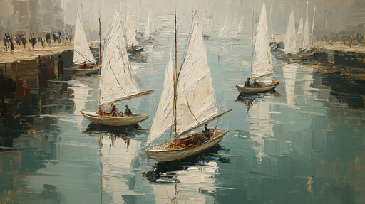 Vivawalls StoreA serene impressionist oil painting mural capturing a fleet of sailboats with crisp white sails gliding on calm, reflective water. The palette of s...