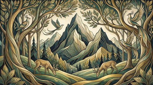 Vivawalls StoreA stunning stylized landscape mural inspired by Art Nouveau. It features a symmetrical framing of trees intertwined with mythical birds, looking o...