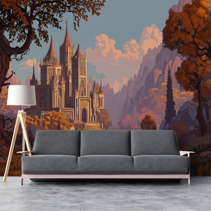 Crogiolati nella soffice e calda luce dell'ora dorata con questa serena carta da parati, che presenta un'elegante castello annidato in una valle circondata dalla bellezza autunnale. Alberi in tonalità di arancione caldo con accenni di verde e viola punteggiano il paesaggio, guidando lo sguardo verso la maestosa architettura. Lontane montagne si ergono contro un cielo blu e rosa tenue, aggiungendo profondità e grandiosità alla scena. Un tranquillo ruscello scorre dolcemente in primo piano, riflettendo l'atmosfera pacifica. Questa illustrazione evoca un senso di pace, maestosità e la bellezza affascinante della natura in autunno, perfetto per creare uno sfondo calmante e pittoresco in salotti, sale lettura, o qualsiasi spazio che apprezzi viste panoramiche ed eleganza architettonica.