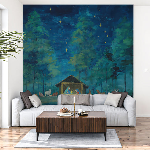 Visualizza tutti i dettagliForest Nativity Oil Sketch Mural Wallpaper | Impressionistic Trees, Deep Blue Night, Romantic Glow