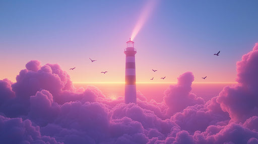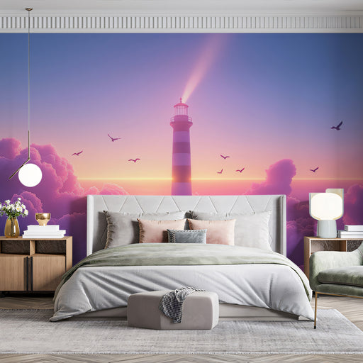 Visualizza tutti i dettagliMurale di carta da parati con faro sopra le nuvole | Fantasia eterea del tramonto costiero