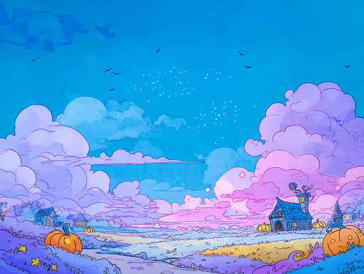Visualizza tutti i dettagliPaesaggio Sognante con Nuvole Inquietanti per Sfondo di Halloween | Campi sotto un Cielo Pastello