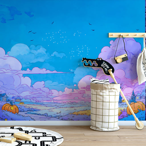 VIVAWALLSFluttua attraverso un paesaggio di Halloween onirico con questo affascinante sfondo, che presenta vaste distese sotto un cielo pastello mozzafiato....