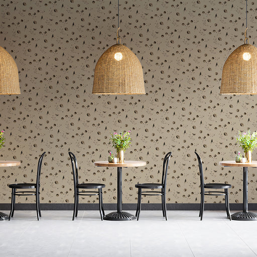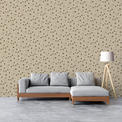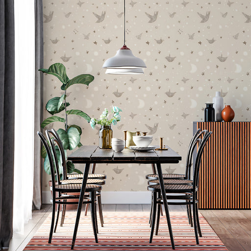 Visualizza tutti i dettagliCarta da parati con puntini celesti | Uccello e luna in tonalità terrose