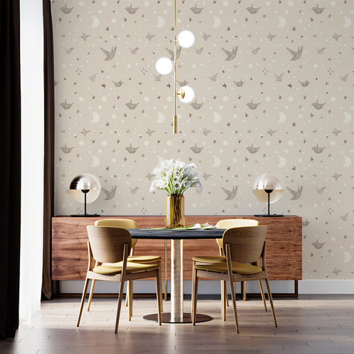 VIVAWALLSA minimalista ed elegante Carta da parati con un motivo sottile e sparso di piccoli uccelli e lune. Il design è realizzato in un grigio molto pall...