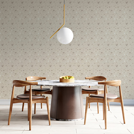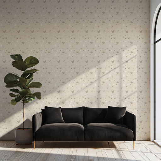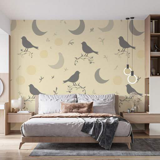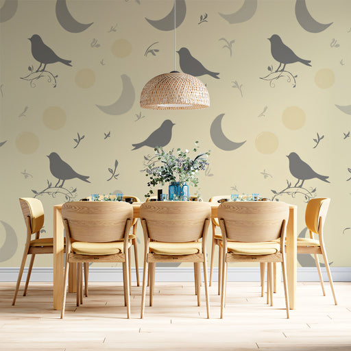 Visualizza tutti i dettagliMural Wallpaper con Uccello e Mezzaluna Stilizzati | Grigio Sereno e Crema