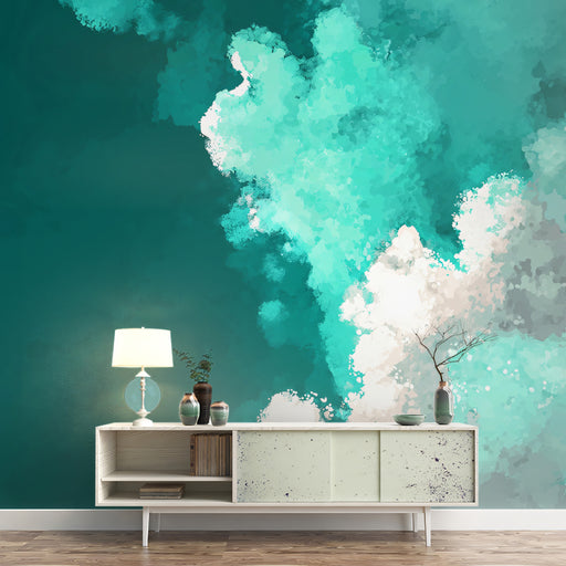 Visualizza tutti i dettagliCarta da parati murale astratta con nuvole acquarello | Verde acqua e bianco