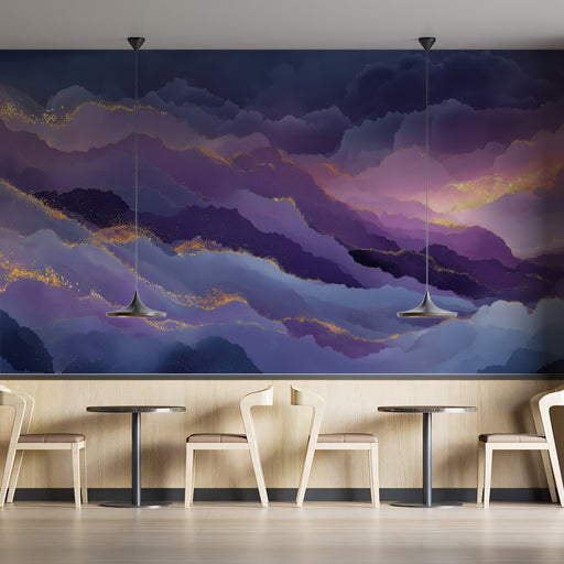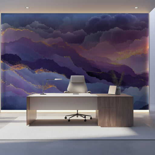 Visualizza tutti i dettagliCarta da parati murale viola celestiale | Montagne e nuvole dorate astratte
