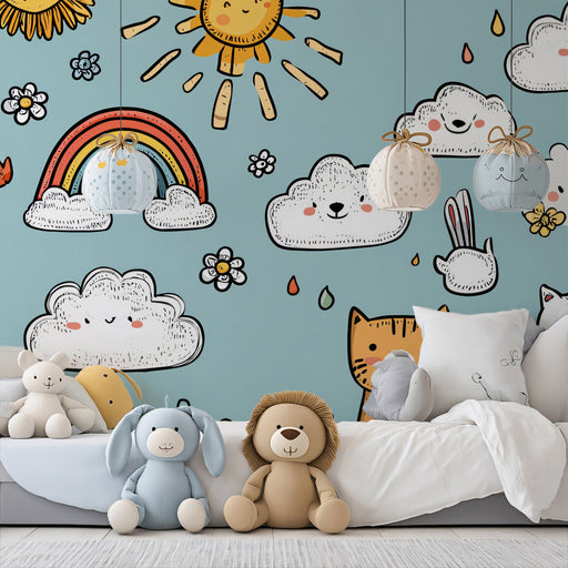 Visualizza tutti i dettagliCarta da parati nuvola animale doodle | Disegnata a mano, kawaii, stampa celeste per nursery