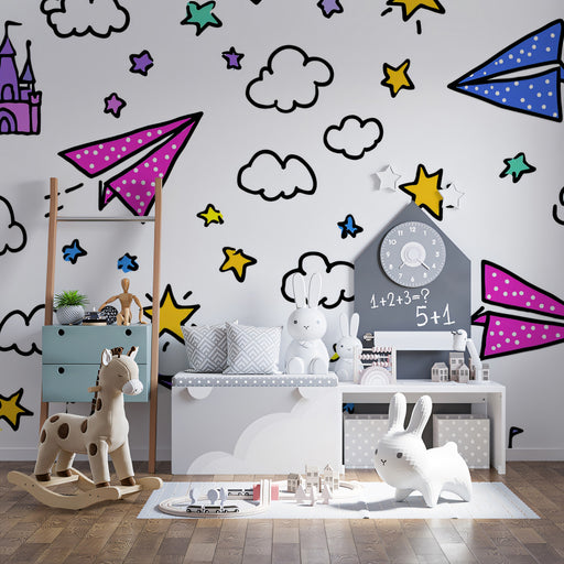 VIVAWALLSIl motivo del Castello e delle Stelle Doodle è un design luminoso e affascinante. Il motivo presenta cartone animato disegnato a mano elementi—cast...