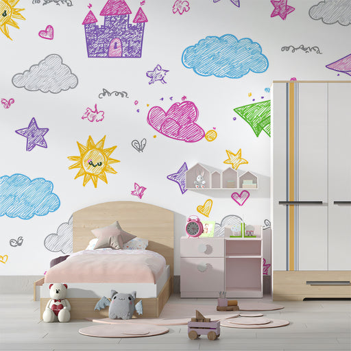 Visualizza tutti i dettagliCheerful Castle and Sun Pattern Mural Wallpaper | Scribble Doodle, Bright Pastels, Whimsical Kids' Design