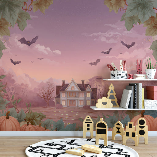 Elegant Haunted Manor Sunset Wallpaper | Paesaggio di Halloween Rosa con Pipistrelli