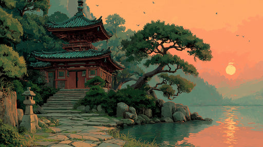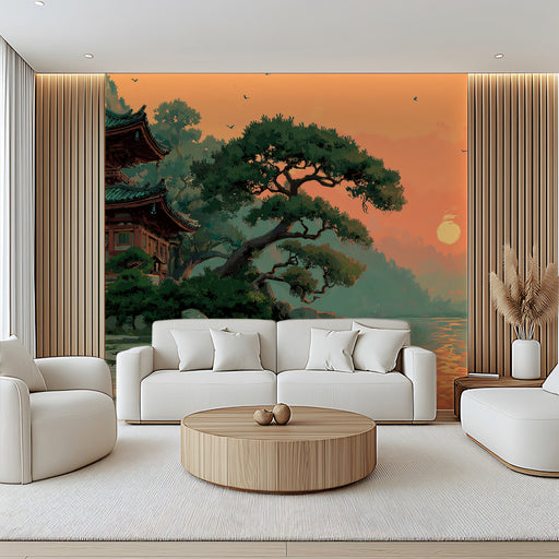 Visualizza tutti i dettagliPaesaggio Sereno di un Tempio Giapponese Carta da Parati | Tramonto Asiatico con Pagoda