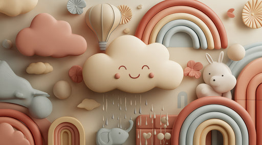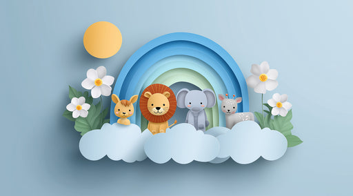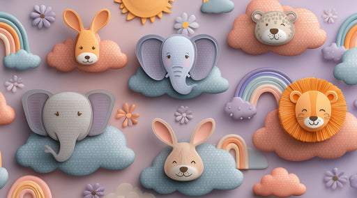 Visualizza tutti i dettagliMotivo nuvola animale 3D per nursery | Colori pastello, rilievo cartone animato, elefante e leone