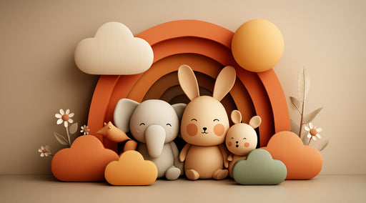 Visualizza tutti i dettagliMurale Animale Boho 3D per la Stanza dei Bambini | Tonalità Calde Terrose, Coniglio ed Elefante, Arco Arcobaleno