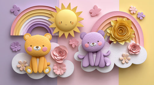 Visualizza tutti i dettagliMurale Arcobaleno Orsetto di Peluche 3D | Viola e Giallo Pastello, Arte Fiori di Carta, Tonno Diviso per la Stanza dei Bambini