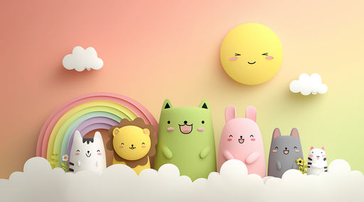 Visualizza tutti i dettagliMurale Animale 3D in Scultura Morbida | Arcobaleno Pastello, Gatti e Coniglietti Carini, Colori del Tramonto
