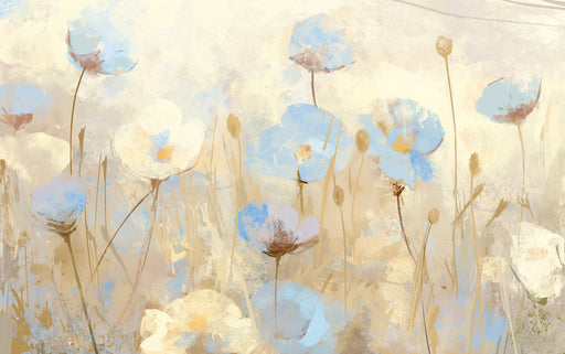 Carta da parati murale con campo di fiori blu per studio | Blu beige e fiore marrone
