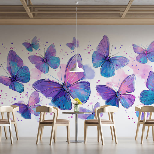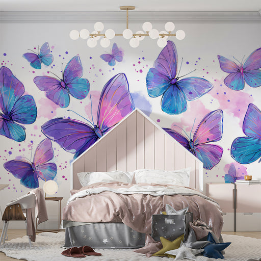 Carta da parati murale con stormo di farfalle viola e blu | Arte acquerello luminosa