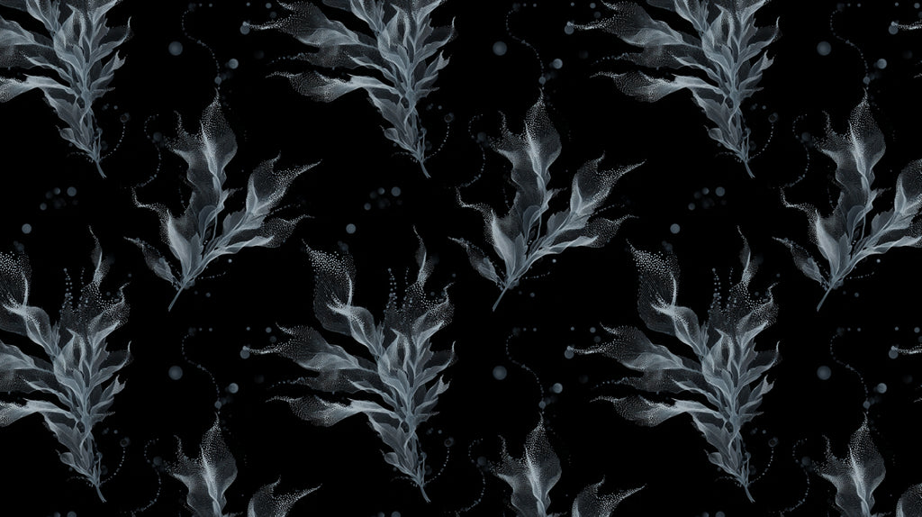 La carta da parati con murale di alghe marine scure è un design cupo e intrigante. Il motivo presenta forme stilizzate e fluide di kelp o alghe realizzato in texture punteggiate di grigio carbone e punti neri su uno sfondo sfondo nero profondo e atmosferico. The design creates a deep-sea or underwater forest feel, offering depth and an edgy organic touch. This mural is ideal for una sala multimediale sofisticata, una sala da pranzo drammatica o uno spazio living contemporaneo.