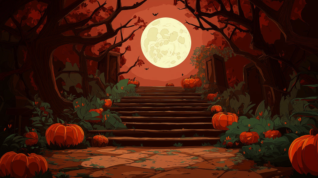 Scendi in una scena di Halloween drammatica con questa suggestiva carta da parati, che presenta una grande scalinata di pietra illuminata dalla luce di una luna piena splendente. Il sentiero è fiancheggiato da abbondanti zucche arancioni brillanti e una rigogliosa vegetazione verde, impostate su uno sfondo di alberi spogli e minacciosi e un cielo rosso sinistro, che suggerisce le profondità di una foresta infestata. Stormi di pipistrelli aggiungono un tocco classico inquietante, aumentando l'atmosfera misteriosa. Questa illustrazione è perfetta per creare una ambientazione di Halloween audace e tematica in sala giochi, camere dei bambini, o spazi in cui desideri fare un'affermazione stagionale forte.