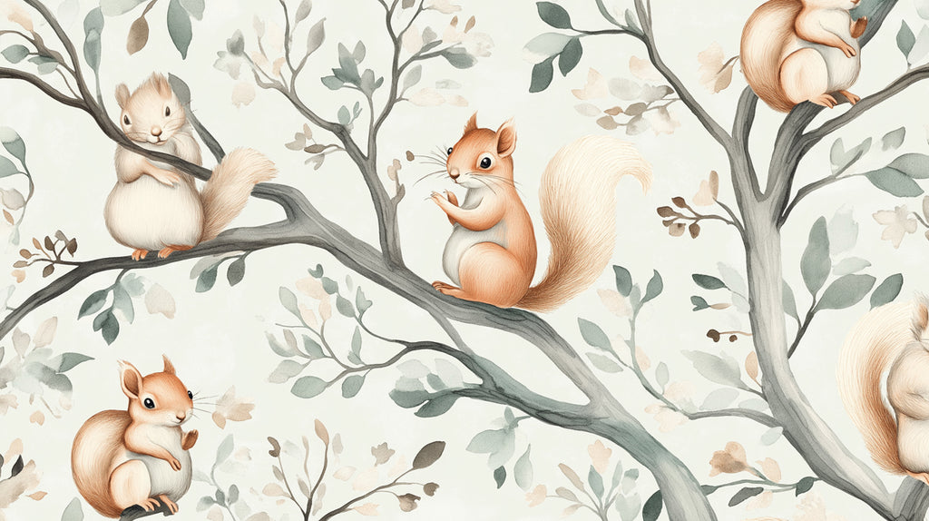 Aggiungi un margine di sicurezza di 6-10 cm. L'area totale è calcolata in metri quadrati e arrotondata al numero intero più vicino.Carta da parati con scoiattoli giocosi | Bosco rustico