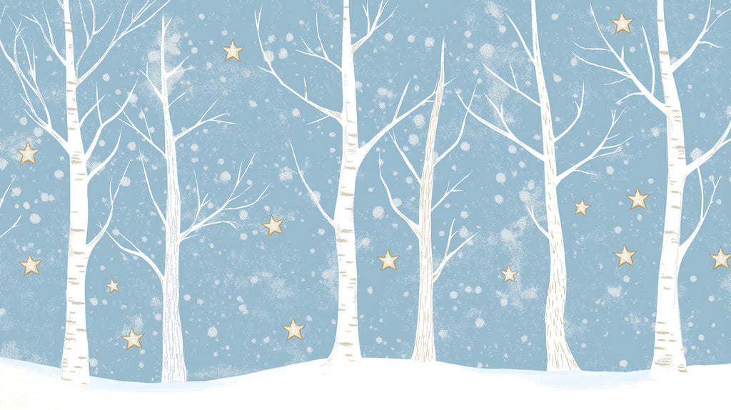 La Tappezzeria Murale con Foresta di Betulle Capricciosa presenta una scena deliziosa di una foresta innevata, con betulle bianche che si ergono in un paesaggio coperto di neve. Un cielo leggero e azzurro chiaro fa da sfondo, riempito con delicati fiocchi di neve cadenti e stelle dorate sparse. Lo stile incantevole e dipinto a mano crea un'atmosfera magica e gioiosa, perfetta per uno spazio pacifico e immaginativo.