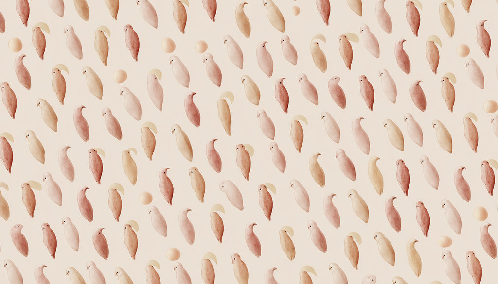 Questa carta da parati presenta un affascinante motivo capriccioso di piccoli uccelli paffuti, realizzato in uno stile acquarello delicato. Il design è reso con una tavolozza morbida di rosa pastello, crema e beige. Le file ripetute di uccelli e piccoli accenti circolari creano un ritmo visivo giocoso e organizzato. È una scelta deliziosa per un sala da pranzo, una studio, o un spazio creativo. Si abbina perfettamente con bohémien moderno, nursery, o eclettico arredamento.
