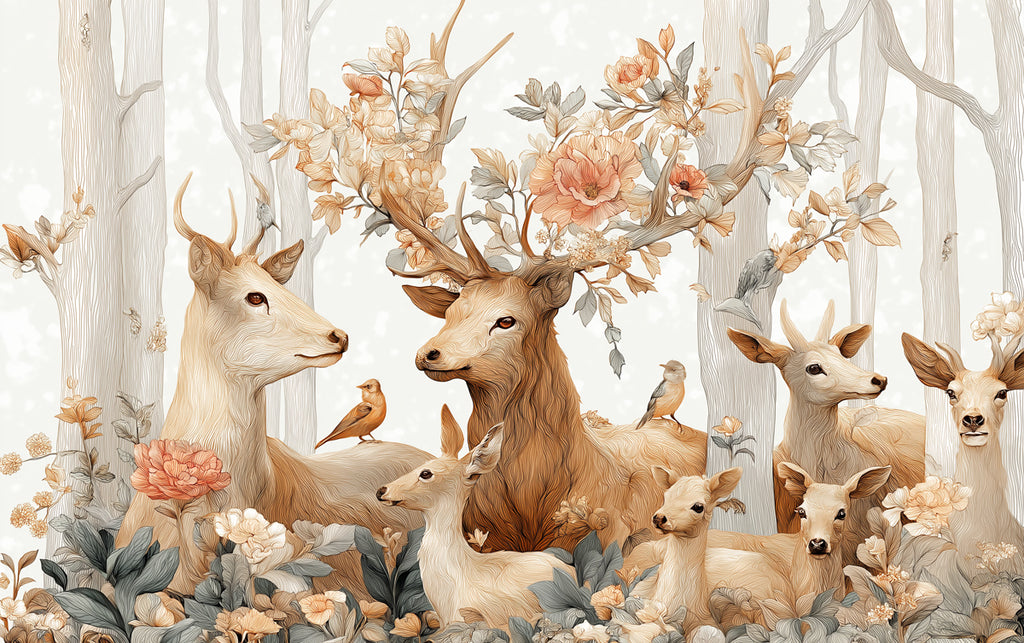 Immergi la tua casa in un mondo magico e fiabesco con questa Carta da Parati Murale con Cervi Capricciosi. Il design presenta una famiglia di eleganti cervi con intricati palchi adornati di fiori, inseriti in un bosco fatato di alberi bianchi e grigi delicati. Le ricche e morbide tonalità di rosa cipria e pesca caldo sui fiori creano un'atmosfera romantica ed eterea. I dettagli delicati dei cervi e gli elementi floreali lussureggianti rendono questa carta da parati un pezzo d'arte murale davvero incantevole. Questa carta da parati è perfetta per creare un'atmosfera serena e sognante in un soggiorno, una nursery affascinante o un camerino romantico.