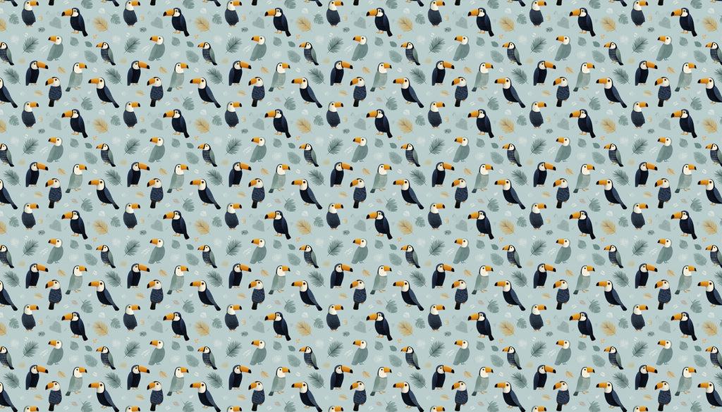 Aggiungi un margine di sicurezza di 6-10 cm. L'area totale è calcolata in metri quadrati e arrotondata al numero intero più vicino.Carta da parati murale con motivo di tucani capricciosi | Uccelli tropicali moderni