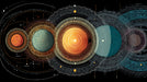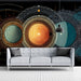 The Galactic Alignment Mandala Mural Wallpaper presents a sophisticated, monochromatic interpretation of a planetary system. Planets are shown in a horizontal alignment, each surrounded by concentric rings of intricate, mandala-like, hand-drawn geometric patterns. The color palette is restricted to warm gold, orange, deep teal, and black, giving the artwork a high-tech, yet ancient and spiritual feel. The fine detail and complex layering are the focal points. This mural is perfect for a minimalist office, an architectural study, or a bedroom seeking a visually quiet yet highly detailed piece of art.