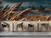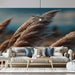 Evoke the warmth of a sunset field with this cinematic nature mural. Soft, feathery pampas grass glows in golden-brown tones against a deep blue sky. This design adds a touch of softness and organic texture to any room, perfect for a cozy bohemian-style living area or a romantic cafe.