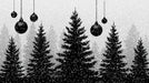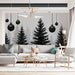 The High Contrast Snowy Forest Silhouette Mural Wallpaper is a powerful, minimalist, and dramatic winter scene. A dense, multi-layered forest of evergreen trees is rendered in stark black silhouettes, heavily contrasted against a bright, textured white snowfall and a gradient gray/white sky. Hanging black ornaments add a touch of abstract holiday decor. The scene is both atmospheric and graphic, focusing entirely on contrast, form, and texture. This mural is ideal for a minimalist design, a living room, or a space seeking a striking, modern winter aesthetic.