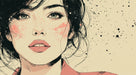 Make a bold artistic statement with this contemporary portrait mural. Featuring a beautifully sketched woman with black hair, delicate freckles, and vibrant red lips, the design is accented by playful pink and black ink splatters. It is an edgy, high-fashion choice for a creative studio or a chic master bedroom.