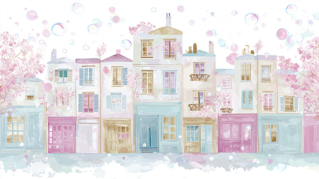 The Pastel Springtime Parisian Street Mural Wallpaper is a whimsical and airy piece of art. The design features a delightful, stylized Parisian street with two-story buildings painted in a refreshing palette of light pink, baby blue, and gentle beige, giving them a frosted, sugary appearance. The scene is surrounded by delicate pink cherry blossoms and large, translucent soap bubbles floating high above the rooftops. The loose, soft watercolor texture and the light, fantasy elements create a dreamy, joyful atmosphere. This mural is an ideal choice for a little girl's bedroom, a charming play area, or a powder room that seeks a touch of lighthearted, magical charm.