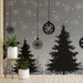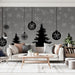 The Silhouette Forest and Snowflake Ornament Mural Wallpaper foreground features a strong silhouette of a dense evergreen forest, set against a lighter gray background filled with falling snowflakes and hanging, decorated black ornaments. The contrast and layered silhouettes create a sense of depth and a sophisticated, modern, and non-traditional Christmas aesthetic. This mural is ideal for a minimalist entryway, a contemporary living room, or a space where clean, graphic design is prioritized.